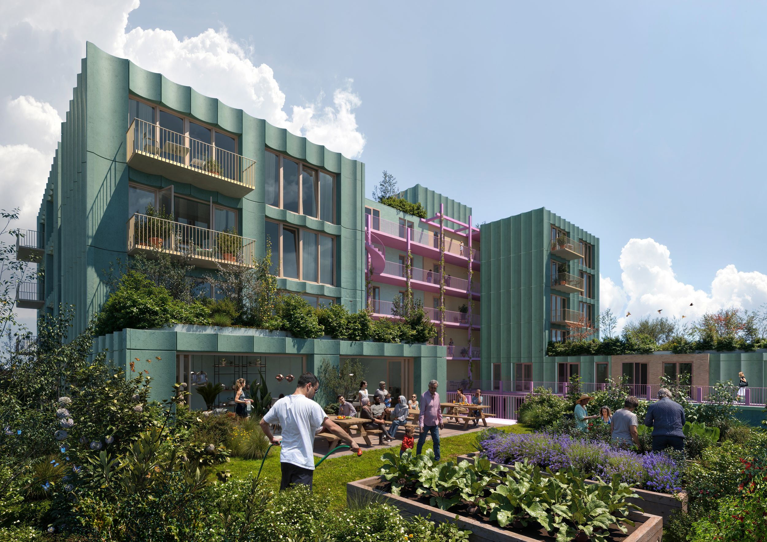 Opvallend zijn de kleuren. Die springen eruit. Ook het groenontwerp is uitbundig: met daktuinen, groene gevels, een binnentuin en een open verbinding met het park in City West.